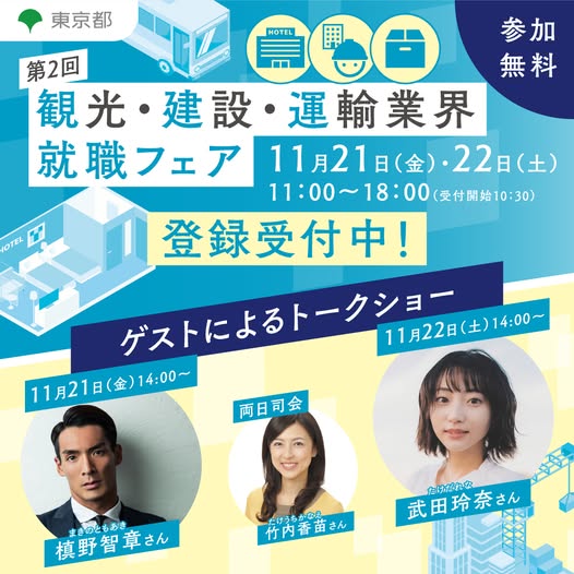 インバウンド需要の拡大や国際的なイベント開催、生活様式の変化などに貢献し、東京の暮らしや経済を支え、成長を続ける「観光・建設・運輸」業界の求人企業が集まる就職イベントです。